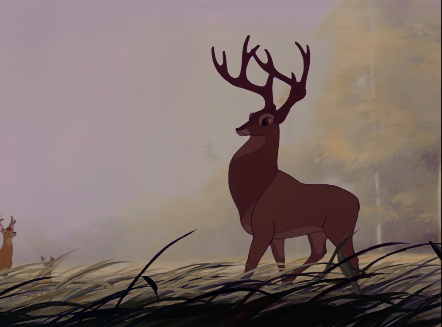 With this long shot, we get our proper introduction to the Great Prince of the Forest, a mysterious and enigmatic character who will later on play a larger role in Bambi's life. As majestic and powerful as the other deer were, there is someone greater than they.
